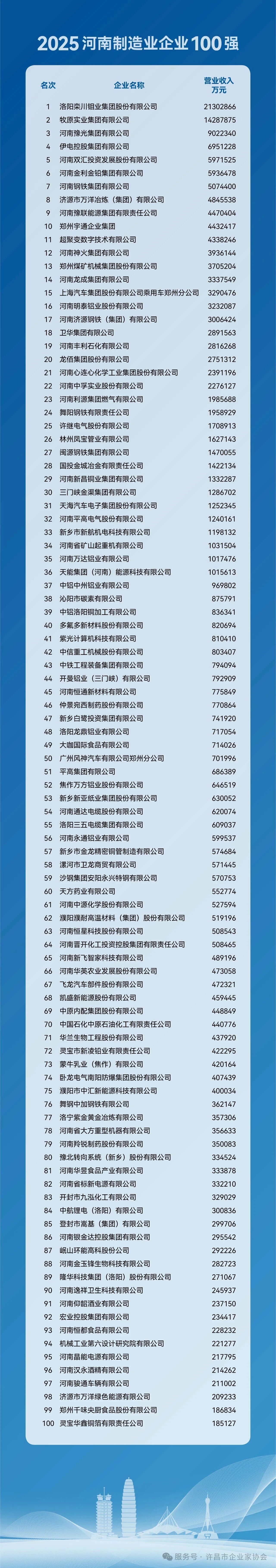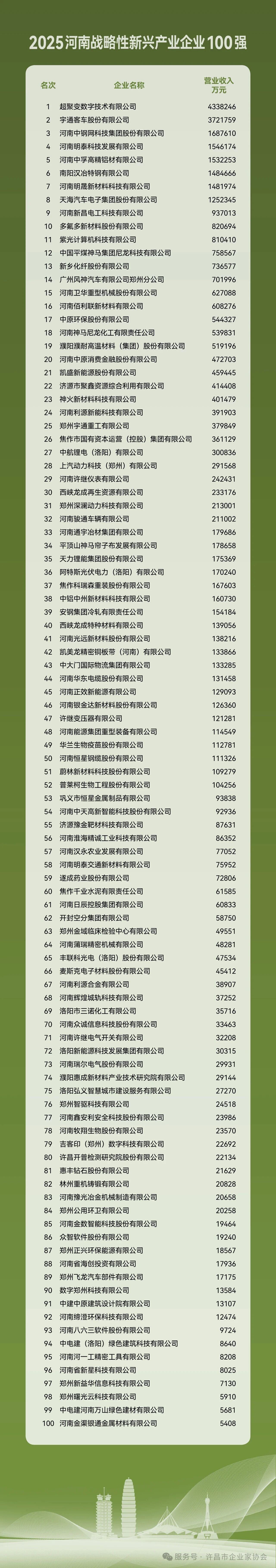 11月12日,“2025河南企業(yè)100強發(fā)布會”在鄭州隆重舉行。本次發(fā)布會由河南省企業(yè)聯(lián)合會、河南省企業(yè)家協(xié)會(以下簡稱“省企聯(lián)”)主辦,許昌市企業(yè)家協(xié)會應邀參加。會上正式發(fā)布了《2025河南企業(yè)100強發(fā)展報告》及百強企業(yè)名單,許昌市多家優(yōu)秀企業(yè)榜上有名,其中包括許繼電氣股份有限公司、許昌胖東來商貿(mào)集團有限公司等知名企業(yè)。